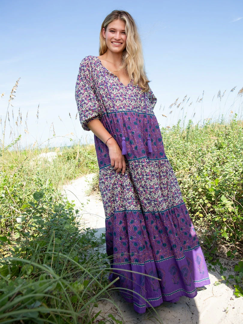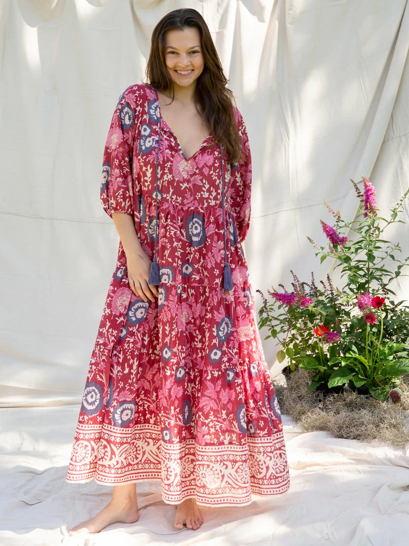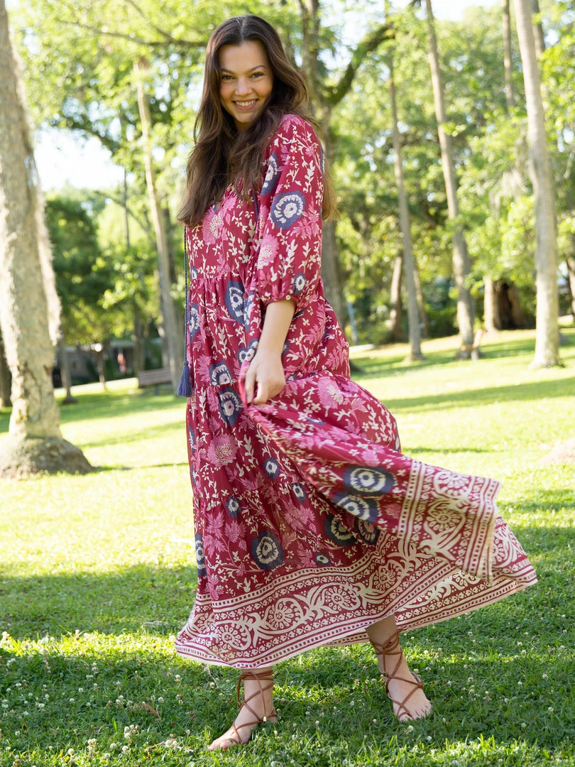 The Auguste Boho Maxi Dress is so relaxed & comfy! We love the puffed sleeves and whimsical floral tiers of soft cotton. In this dress, you can be comfortable curled up on the couch or visiting a new city. You’ll look like you put a lot of effort into your outfit, but you’ll be drawn to it simply because of its comfort and charm! Tie your tassels or leave them undone. If you don’t like an oversized look, just size down for a slimmer fit. Either way, you’ll look and feel beautiful in this bohemian inspired dress.