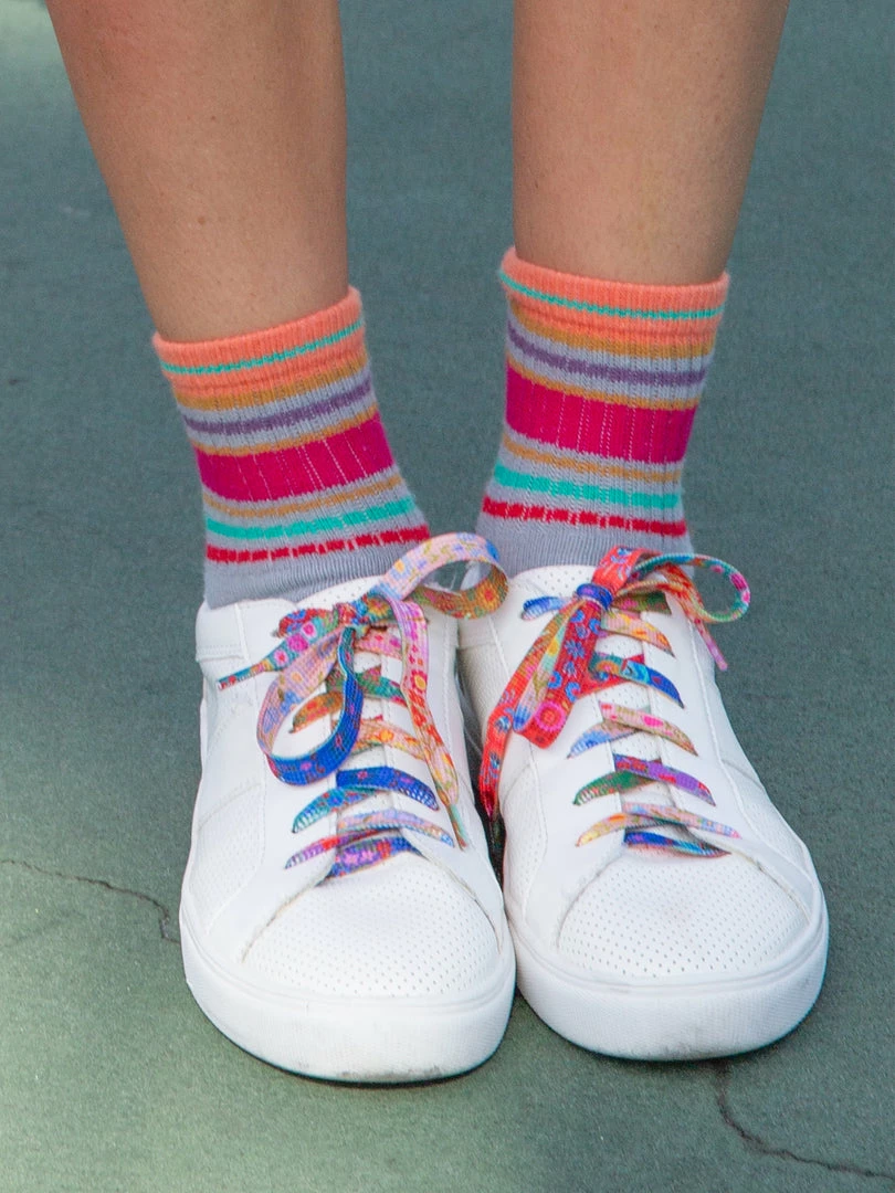 You can never have too many cute pairs of socks! These crew socks are retro inspired and are soo comfy! The striped details look so fun peaking out of your ankle boots, sneakers or Birks! We love them!