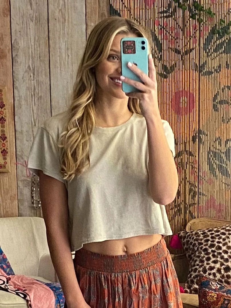 The best everyday tee ever… it’s a wardrobe staple! The All Day Tee looks great worn alone, or layered under jumpsuits and kimonos! It features a cropped silhouette and a linen blend material… making it soo comfy and easy to wear anywhere!