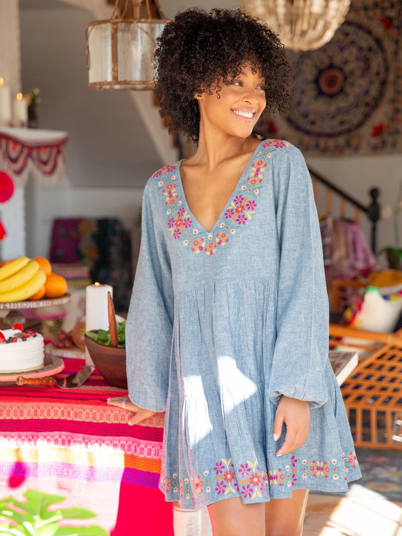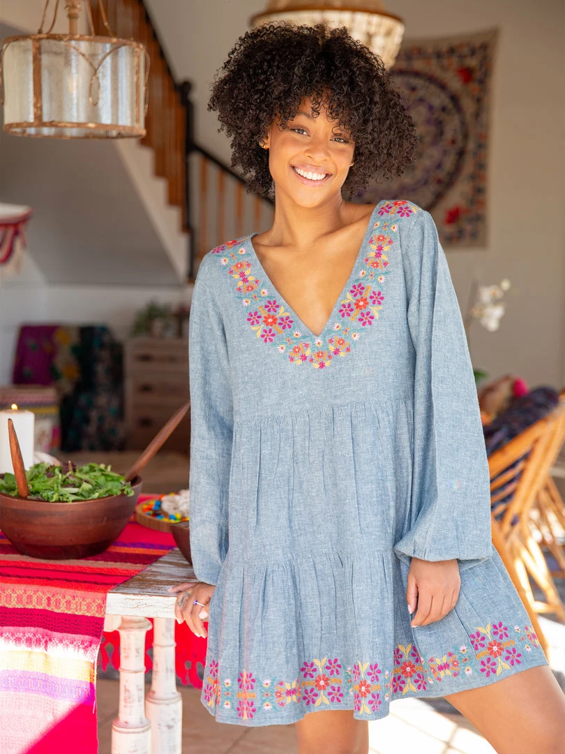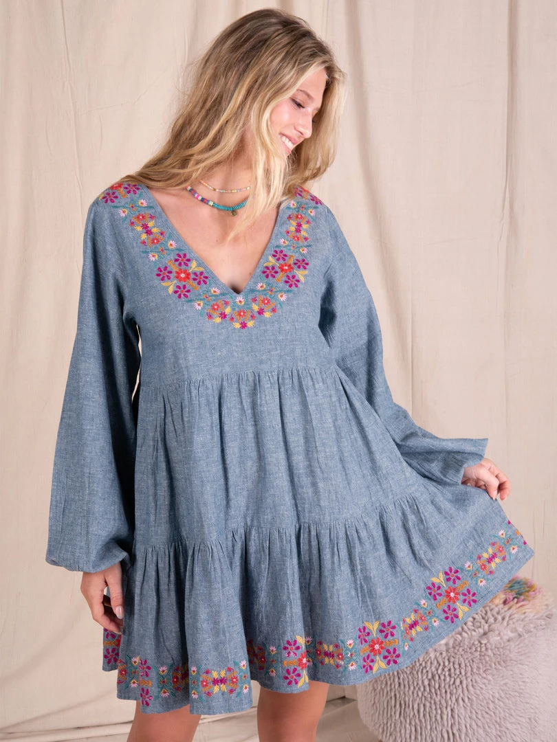 We love everything about the Embroidered Taryn Dress! It features a feminine v-neckline, flouncy tiers, balloon sleeves and hand-embroidery! Its chambray linen material is super lightweight and airy for those hot summer months. It’s the perfect dress for any summer occasion!