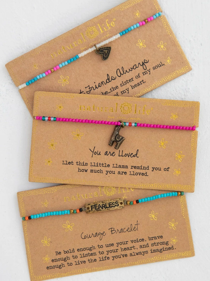 This sweet bracelet is the perfect gift to give to friends and family. It’s made with colorful glass and ceramic beads with a special metal charm that will help encourage you or remind someone how special they are. The little story on the card will help you pick the right one for each person!