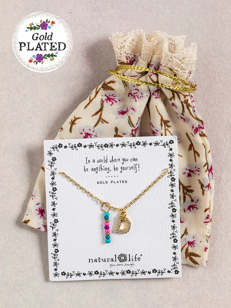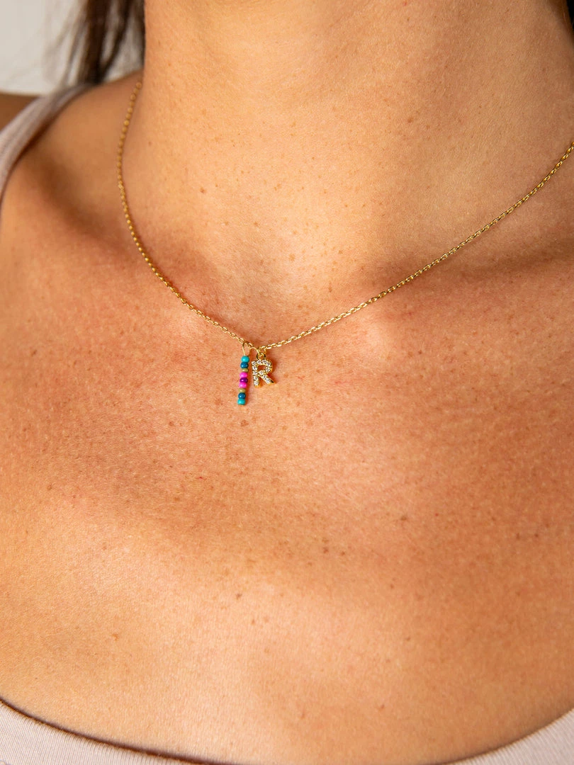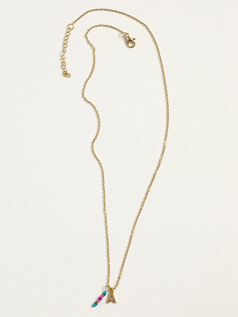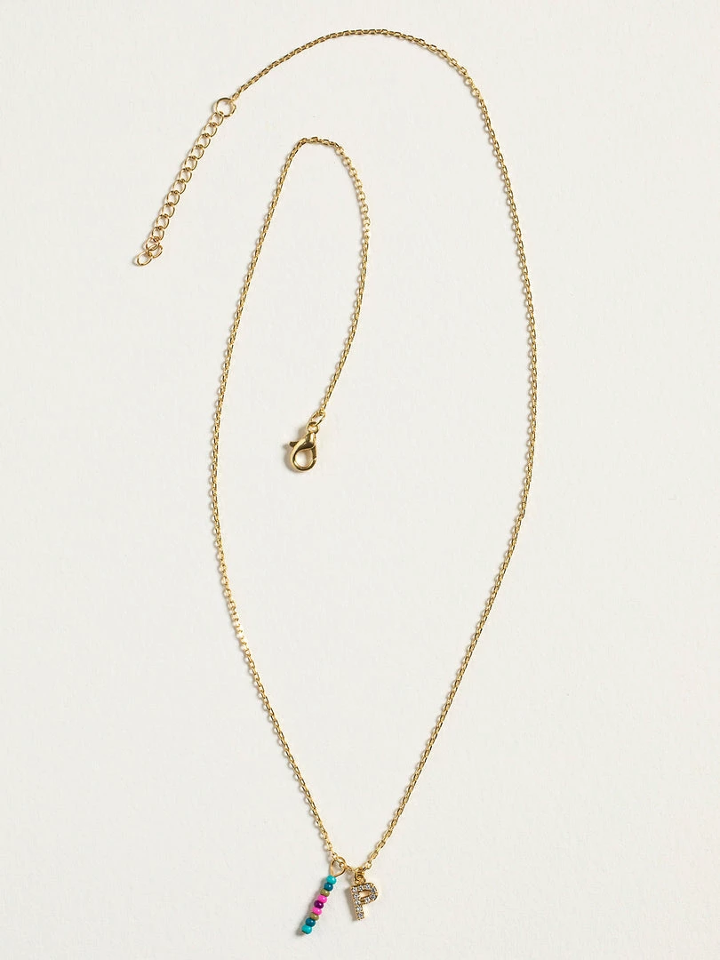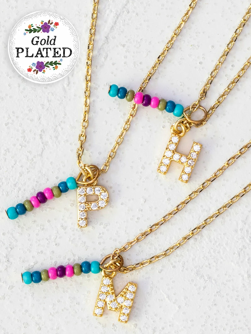 Personalized gifts are the best for giving! This necklace features a single gold-plated initial charm with tiny rhinestones and a colorful hand-beaded charm to add to its touch of personalization. It comes in the prettiest givable bag and can adjust up to 19 inches in length, making it great for wearing alone or with our other necklaces for a layered look!