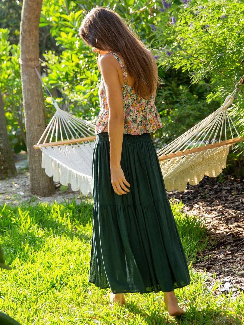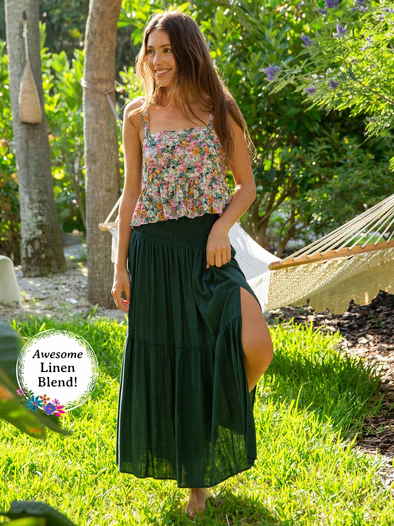 The Angelina Midi Skirt is one of our favorites! This easy pull-on features a smocked waistband, a tier and front slit over the left leg. It’s so flowy & fun to wear, especially with one of our cute tops!