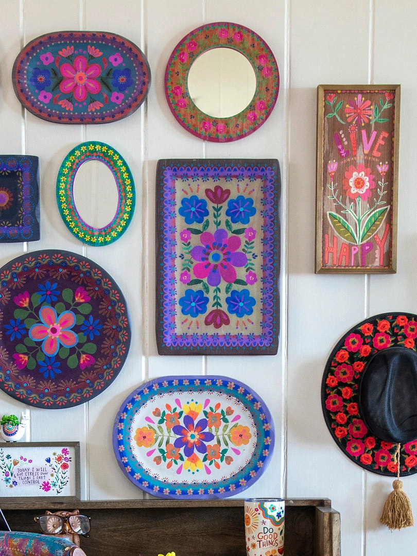 The story behind this Bungalow Art is what makes it so special to us! We got inspired during one of our artist retreats and this piece of wood was passed around to all of our artists. Each one of them painted a little something on it to add their own little creative touch. We loved it so much, we decided to make it for you! It features a rustic feel and the prettiest bohemian art. It’s tuckable, so it’s perfect for a shelf, inside a nook or you can hang with other pieces to make a gallery wall!