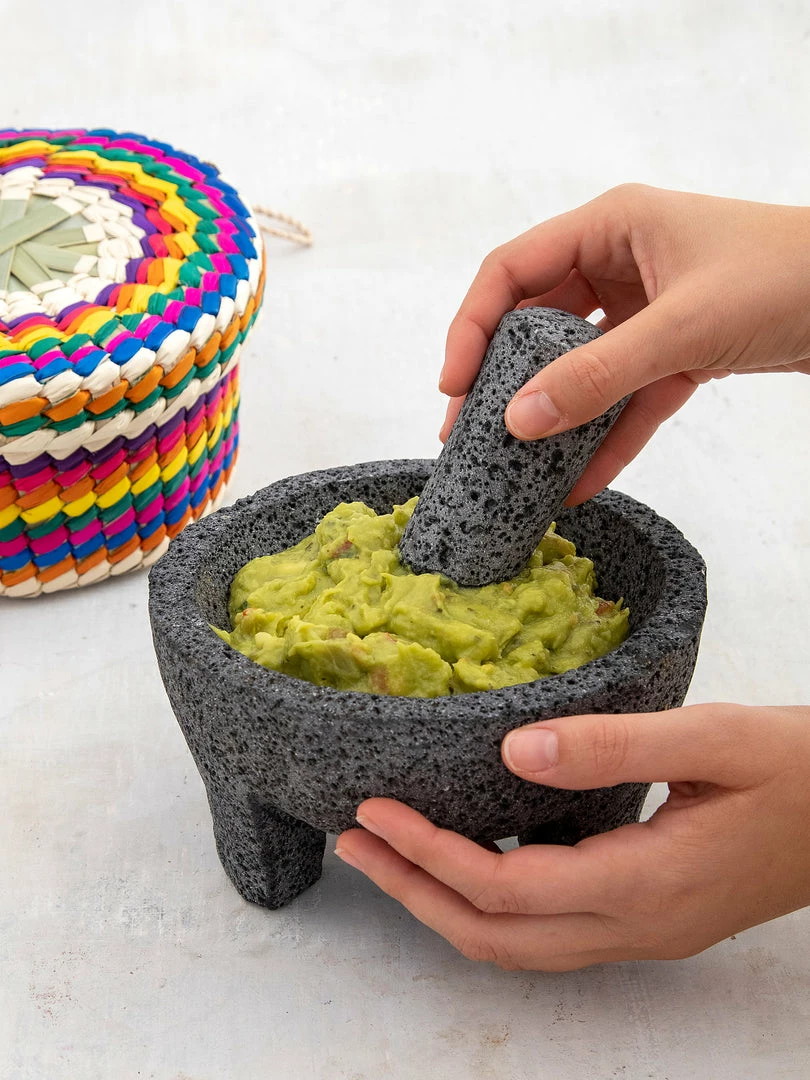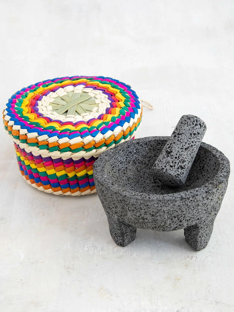 The Molcajete & Tortilla Basket is one of our favorite things we’ve made! The mortar and pestle are handmade from lava rock by artisans in Mexico. It’s the traditional tool for making guacamole and salsa fresca that you can blend and serve right out of the bowl! The inside of the bowl is textured for crushing whole spices into spice blends or rustic sauces. It comes in a traditional colorful palm frond handwoven basket that will keep tortillas warm at the table while you’re passing the food around. You can even line the basket with lettuce leaves to use as an all-purpose serving bowl!