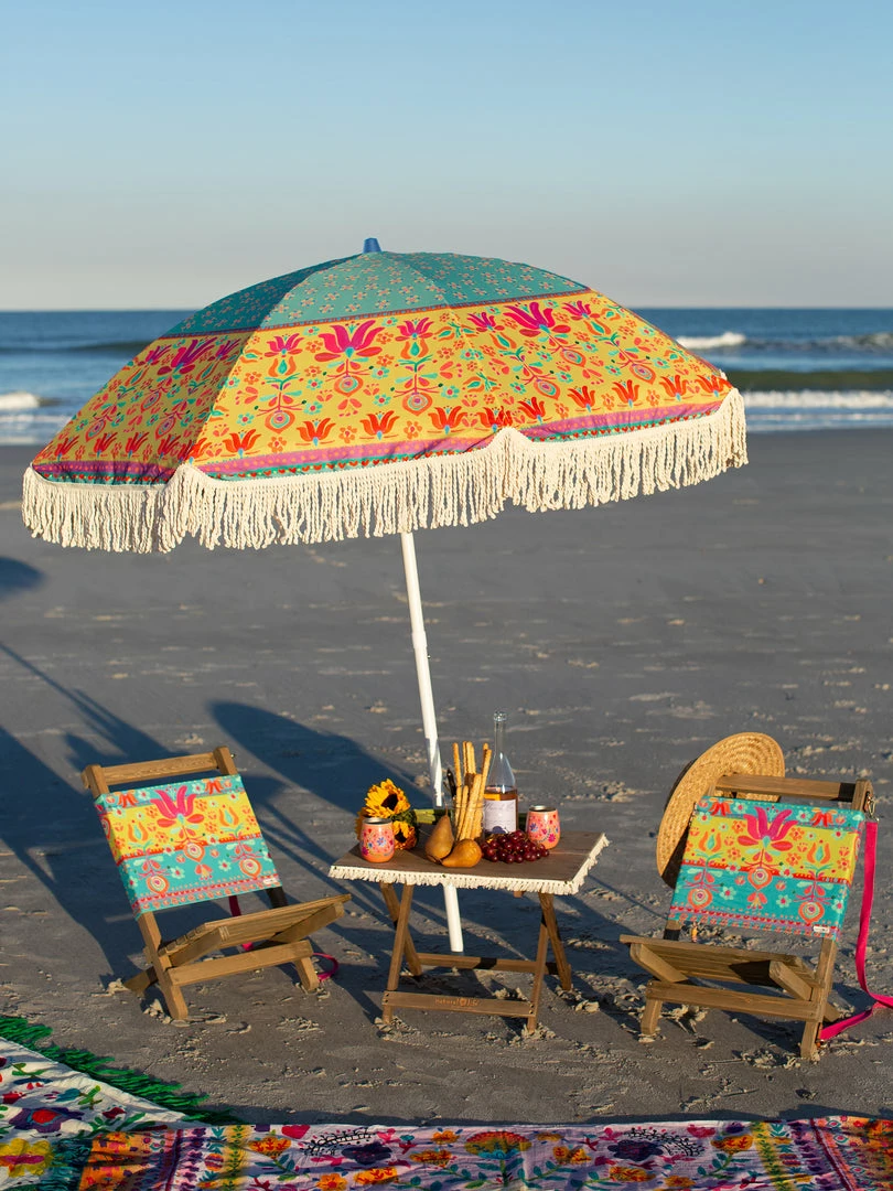 A tiny foldable picnic table you can take anywhere! When it’s folded up, the handle makes it so easy to carry to the beach, picnics or even to your backyard for a tea party! We had to give it a bohemian flare with the cream fringe details… and it’s so cute! We love using this little table with floor pillows, inside or outside!